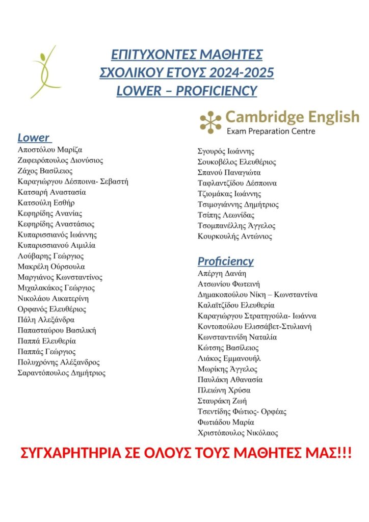 ΑΠΟΤΕΛΕΣΜΑΤΑ ΕΞΕΤΑΣΕΩΝ LOWER – PROFICIENCY ΣΧΟΛΙΚΟΥ ΕΤΟΥΣ 2024-2025